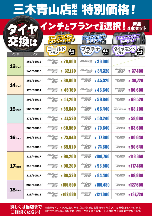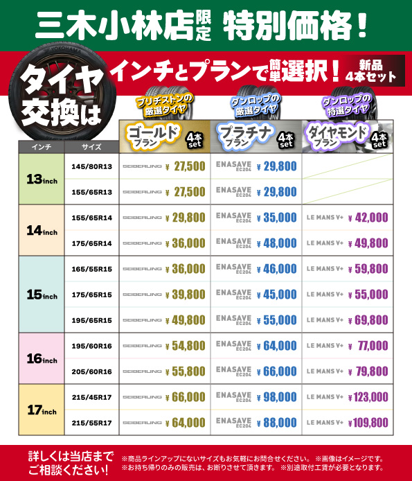 当店では、三木市・小野市・加東市・三田市・神戸市北区・加古郡(稲美町・播磨町)エリア地域最安値帯の価格でタイヤ交換を実施しています。